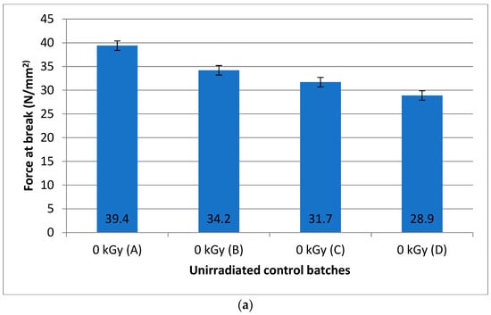 Figure 2 presents the tensile stress mean values obtained for the four non-irradiated batch samples A, B, C, and D, and for exemplification, the original stress–strain curves for unirradiated samples (batch A). All the experimental data are available upon request from the authors.