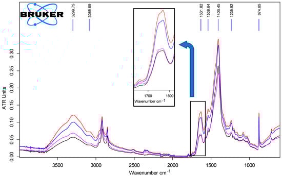The ATR-FTIR spectra of the control batches from the head area sampling are shown in Figure 3. It can be observed that there is a decrease in the intensity of the FTIR spectrum when furthering from the backbone area (A) to the belly area (D), which is in agreement with the measured decreased tensile stress. High mechanical resistance of the sample provides a good contact with the ATR crystal and a stronger intensity spectrum, while the loose parchment structure of the belly area produces a less intense vibration band spectrum. In the parchment FTIR spectra, the following main collagen bands are observed: amide A (3300 cm−1), amide B (3086 cm−1), amide I (1632 cm−1), amide II (1539 cm−1), and amide III (1233 cm−1) []. The multiple maxima of amide I of the 1650 cm−1 band indicate the various collagen protein conformations: alpha, beta, or random structures. The alpha helix structures are depicted by the left maximum of the amide I band while the random structures are described by the right maximum. An increase in the random structures peak maxima intensity in the belly area was observed, which is in accord with the mechanical tests that showed a decrease in the mechanical strength, i.e., tensile stress (see inset of Figure 3).