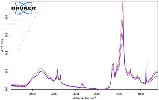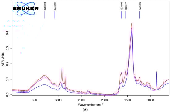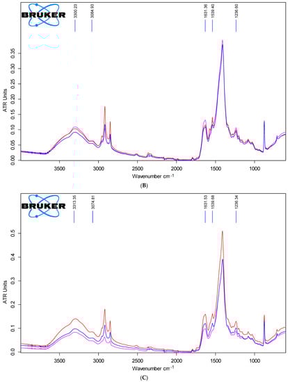 A second method of analysis was used, namely, FTIR by ATR technique, in order to observe the natural variability of the parchment structure and the possible changes at the molecular level after gamma irradiation, using a Bruker Vertex 70 machine, with a wavenumber range of 4000–400 cm−1, 4 cm−1 resolution, and diamond crystal ATR accessory. Ten measurements were conducted per sample and there were 256 scans per measurement. The results were mediated, thus a single spectrum resulted from the ten measurements. A total of eight control samples, four from the head area and four from the tail area, were collected from the extremes, head and tail, when furthering from the backbone to the belly. The samples were collected from the four interleaved non-irradiated batches corresponding to batch A, B, C, and D from head and tail areas to analyze anatomical position influence on the collagen parchment structure. In the case of the irradiated batches for each sample, there were also ten spectra measurements.
