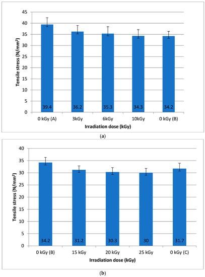 For the interval no. 2, the tensile stress of 31.2 N/mm2 for 15 kGy is above the non-irradiated batch B value of 31.7 N/mm2 when including the values of the standard error of the mean 1.66 N/mm2, respectively, 2.22 N/mm2. This result concludes no damaging effect of the 15 kGy radiation treatment.