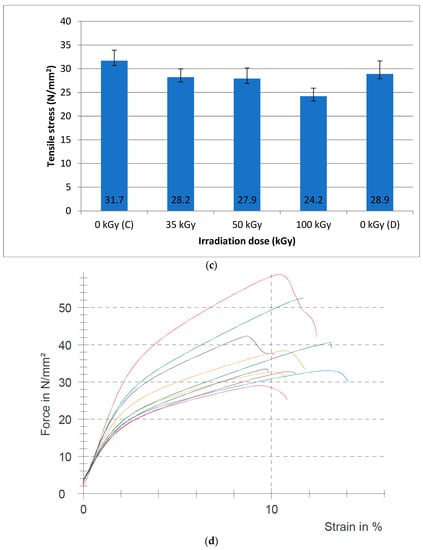 For the interval no. 3, a damaging effect is observed at 100 kGy, and the value of 24.2 N/mm2 is lower than the natural decrease in tensile stress for the non-irradiated batch D, 28.9 N/mm2. Additionally, for the irradiated samples at 35 and 50 kGy, the tensile stress is below the non-irradiated control batch D (28.9 N/mm2), i.e., 28.2 and 27.9 N/mm2, respectively.