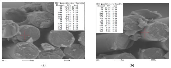 Table 2 presents the average values of elemental composition for the core of the glass fibers (9 measurements on different fibers’ cross sections) and the jacket (5 measurements). Figure 1 shows the measurement points (indicated by a red cross) for two of these measurements. The differences in composition of the core and jacket of the glass fibers were small; thus, the fibers could be considered as having a homogenous composition as a whole body. For these fabrics, the boron content was higher than those attributed in the literature to high-resistance glass fibers of class D, E or S, which covers a range of 1% to 22%. This content should be attributed to the particular sourcing location of the raw materials. Boron decreases glass thermal expansion and not only increases resistance to vibration, strength, chemical resistance and long-life use, but also increases resistance to high temperatures and thermal shock.