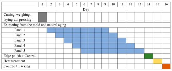 Figure 2 presents a Gantt diagram for manufacturing a set of five panels made of 24 layers of glass fiber fabrics, pointing out natural aging and the heat treatment. It is important to know the processing time for the final products.