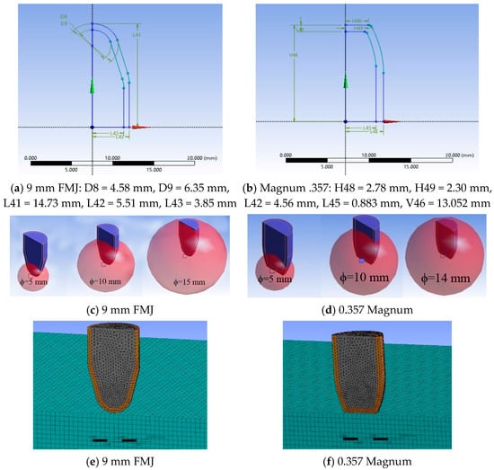 (a,b) Geometry of the projectiles, (c,d) influence spheres with graduate mesh elements for 9 mm FMJ and for 0.357 Magnum, (e,f) details of meshing for the projectiles and panel.