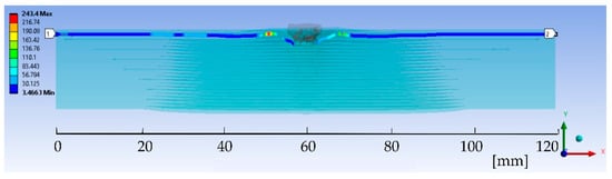 Figure 4 presents an example of von Mises stress distribution for the cross section of layer 2 at moment t = 1.5 × 10−4 s (the end of the simulation) indicating how the distance along the cross section of the panel is measured: 0 is at the left end of the layer, 60 mm is at the symmetry axis through the projectile and panel and 120 mm is at the right end of the layer.