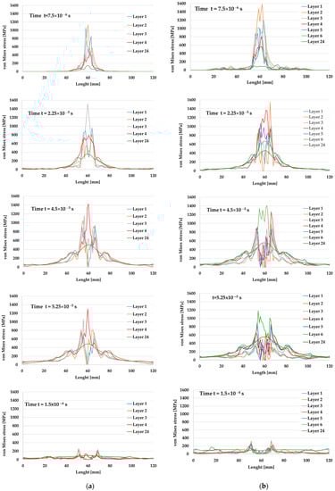 The last moment of simulation, t = 1.5 × 10−4 s, evidenced low values of von Mises stress for all layers in both cases, lower than the yield limit of the layer material model.