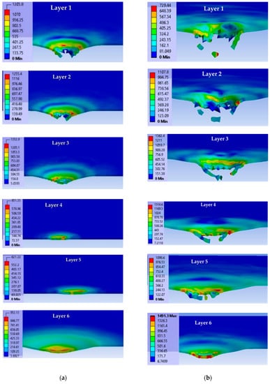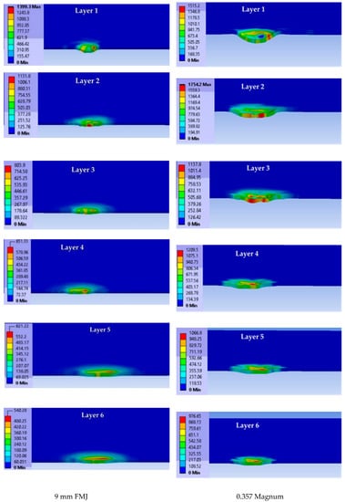 Figure 6 presents layer images in the first moment of the simulation (t = 7.5 × 10−6 s). The impact with the blunt projectile (0.357 Magnum) and higher velocity produced higher values of equivalent stress on each layer (only the first six layers are presented here). One may notice that the equivalent stress distributions have asymmetrical aspects, even if the model is based on symmetrical geometry. This is due to the meshing net and this happens in actual impact, too, as there are not perfect shapes and the actual materials also have structural and composition differences that could generate asymmetry in material loading.