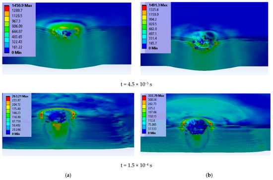 Figure 7 presents von Mises stress distributions on each layer at the moment t = 4.5 × 10−5 s for impact with the 9 mm FMJ at v0 = 375 m/s (left column) and impact with the 0.357 Magnum at v0 = 433 m/s (right column).