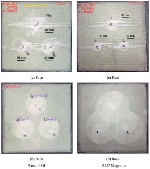 Figure 9 presents macro photos of the panels. The projectiles’ arrests have similar aspects all the three fires. It means that the panel is able to endure multiple hits at a close vicinity (the distance between fires was 120 mm).