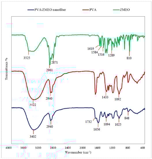 The FTIR spectrum of PVA powder, ZMEO, and PVA/ZMEO fiber is shown in Figure 2. The FTIR spectra of PVA powder had the characteristic peaks at 3422 cm−1 (O–H), 2940 cm−1 (C–H), 1433 cm−1 (CHOH), and 1092 cm−1 (C–O) [12,32]. The FTIR spectra of the pure ZMEO showed the peak at 1516 (C=C aromatic ring), 1289 cm−1 (aromatic ether), 810 cm−1 (CH wagging vibrations), 1584 (N–H bending), 1619 (conjugated double bond of the ring), 2961 cm−1, 2871 cm−1 (asymmetric and symmetric methyl C–H stretching), and 3525 cm−1 (O–H vibration of hydroxyl group) [11,14].