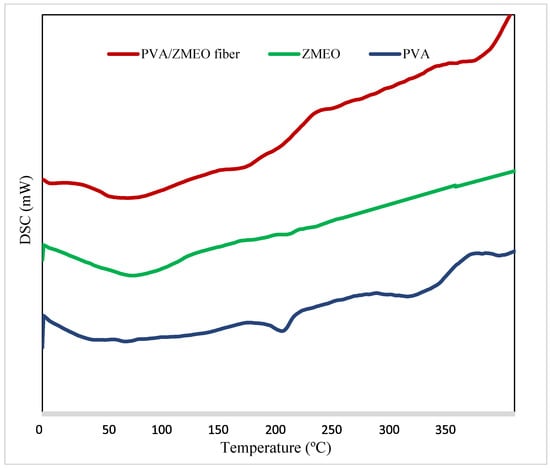 DSC (differential scanning calorimeter) thermograms for PVA powder, ZM essential oil, PVA/ZMEO fiber.