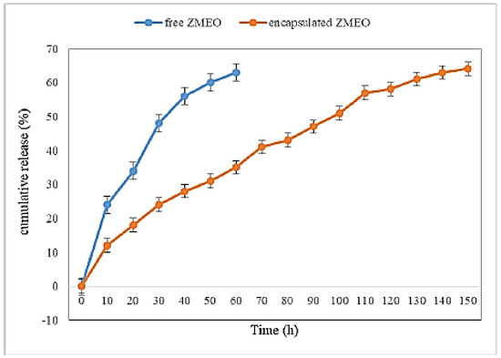 The encapsulation efficiency of ZMEO in the PVA fiber mat was approximately 83.42 ± 21.1%. The release profile of ZMEO in two states (free and encapsulated) was evaluated for 150 h. As shown in Figure 4, free ZMEO was released rapidly at room temperature, with 63% of it having been released after 60 h, while ZMEO encapsulated in PVA fiber mat was released into the atmosphere much more slowly, with only 64% of it having been released after 150 h. ZMEO release was controlled due to the formation of a core–shell structure by the PVA fiber mat during electrospinning [1,10]. Zhang et al., (2019) reported that thymol released quickly within 19 h and thymol encapsulated in fiber was released much more slowly (36% of it during 72 h) [10].