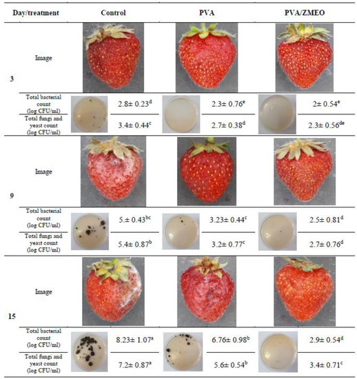 Strawberry is an exceptionally perishable fruit with a limited shelf-life after harvest; therefore, it is used to evaluate the efficiency of active packaging [19]. The total microbial load of strawberries was investigated on 3, 9 and 15th days of storage. As shown in Figure 5, the growth rate of the microbial load on strawberries of PVA/ZMEO group was the lowest because the release of ZMEO from fibers inhibit the growth of microorganisms. Moreover, according to Figure 5, strawberries in the control group had decayed, and their appearance was unacceptable on the 9th day of storage; hence, they cannot be consumed. On the other hand, fruit in the PVA and PVA/ZMEO treatment groups was considered suitable for marketing at the end of the storage period. PVA/ZMEO electrospun fiber enhanced the shelf-life of strawberry via two mechanisms: (1) The PVA and PVA/ZMEO fiber mat absorbed moisture from the respiration of the strawberry inside the package. In control packages, there was sufficient moisture for fungi to grow [31]; (2) Carvacrol and thymol are the major components of ZMEO that have antioxidant and antimicrobial properties [12,31]. ZMEO encapsulation in the PVA fiber mat can gradually release into stored fruit packages, slowing down the ripening process of the treated fruit [22]. Thus, ZMEO significantly reduced microbial growth and maintained the firmness and weight of strawberry. In the control group, the rate of respiratory is high. Strawberry quality and overall appearance could be adversely affected by high-moisture conditions because microorganisms grow rapidly. The results agreed with those of Zhang et al., (2019), indicating that essential oil loaded into fiber mat was gradually released during storage; therefore, fruits can be stored for a long period of time [10].
