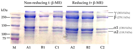 An SDS-PAGE image of the unicornfish bone collagens is presented in Figure 1. The electrophoretic pattern of each sample was almost similar, with two alpha (α1 and α2), one beta (β), and one gamma (γ) chains. The molecular weight (MW) of each alpha chain was estimated as 138.0 kDa and 118.3 kDa, respectively. Benjakul et al. [36] suggested that type I collagen was characterized by the presence of two alpha chains (α1 and α2). Based on this, unicornfish bone collagens were also categorized as type I. All acid-soluble collagens assessed in this study were comparable to previous literature on type I collagen fish collagen from seabass (L. calcarifer) (α1 = 118 kDa and α2 = 105 kDa) [37], loach (M. anguillicaudatus) (α1 = 127 kDa and α2 = 115 kDa) [38], golden pompano (T. blochii) (α1 = 120 kDa and α2 = 100 kDa) [17], and Nile tilapia (O. niloticus) (α1 = 125 kDa and α2 = 114 kDa) [39]. Other electrophoretic chains found in all extracted collagens (i.e., β = 278.1 kDa and γ = 383.0 kDa), indicate dimer and trimer bands as observed in our previous findings on lizardfish (S. tumbil) fish collagens [13,14,15]. Further analysis with addition of β-ME (reducing) and without β-ME (non-reducing), showed no differences in electrophoretic patterns of AASC, LASC, or CASC, and absence of disulfide bonds, as mentioned in previous literature [13,14,15].