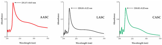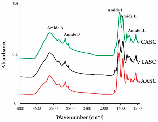 Figure 2 presents the UV absorption spectra of the AASC, LASC, and CASC. In general, a prominent spectrum of fish collagen was located at the wavelengths of 210 nm to 240 nm [40]. All acid-soluble collagens from the bone of unicornfish were within the maximum spectral ranges proposed by previous works, with no significant differences (p > 0.05) among the samples. The highest peak observed in this study was in accordance with other fish collagens, such as Siberian sturgeon (A. baerii) [22], red drum (Sciaenops ocellatus) [41], lizardfish (S. tumbil) [13], and puffer fish (L. inermis) [20]. The spectra observed were associated with the functional groups of carboxyl (-COOH), carbonyl (C=O), and amides (CONH2), which belong to the polypeptide chains of fish collagen, as proposed by Jaziri et al. [13]. Other low absorption peaks (300 nm to 250 nm) were also observed in all extracted collagens and were likely related to the aromatic amino acids, such as phenylalanine, tryptophan, and tyrosine. It is therefore assumed that collagens extracted from the bone of unicornfish contain low composition of aromatic amino acids.