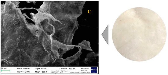 SEM image (magnification 500×) of the acid-soluble unicornfish (N. reticulatus) bone collagen. (A) acetic acid soluble collagen (AASC); (B) lactic acid soluble collagen (LASC); and (C) citric acid soluble collagen (CASC).