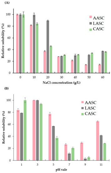 Solubility of the AASC, LASC, and CASC samples was evaluated at different sodium chloride (NaCl) concentrations and various pH conditions. Higher solubility (more than 80% of relative solubility (RS)) was observed in all extracted collagens when treated with low NaCl concentration (0–10%). RS of >85% was recorded in the LASC sample (Figure 5A). This might have been due to the effect of the dialysis process in LASC that completely removed the remaining salt after being salted out during the precipitation process. As a result, no salt was detected in the lyophilized collagen. However, at high concentrations of NaCl (30 g/L to 60 g/L), the RS decreased sharply to less than 40% in all extracted collagens. Chen et al. [41] suggested that at high salt concentration, the hydrophobic–hydrophobic interactions in the polypeptide chain were escalated. The competition for water with salt ions was also increased, resulting in protein precipitation. These results were in accordance with collagens isolated from the skin and bone of Spanish mackerel (S. niphonius) [18], the skin of lizardfish (S. tumbil) [13], the skin and bone of golden pompano (T. blochii) [17], and the cartilage of Siberian sturgeon (A. baerii) [22].