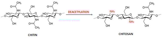 The chitin deacetylation reaction. The deacetylation process and the reactive amino groups formed in it are marked in red. Authors’ own figure from Reference [4].
