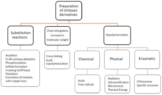 Scheme of reactions leading to the production of chitosan derivatives. Authors’ own figure from Reference [36].