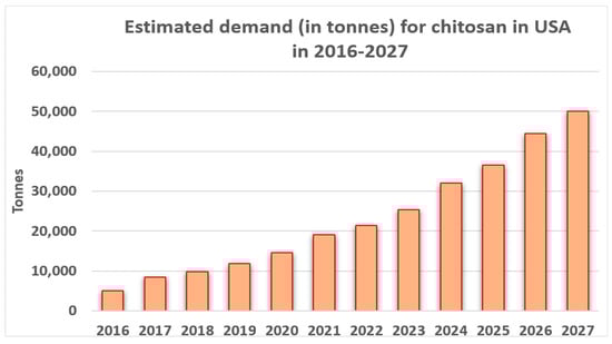 Estimated demand (in tonnes) for chitosan in the United States in 2016–2027. Authors’ own figure from Reference [239].