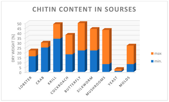 Chitin content in various organisms, in the form of dry matter from minimum to maximum % dry weight chitin content. Authors’ own figure from Reference [241].