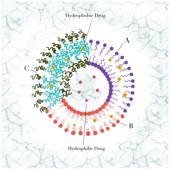 Vesicles are self-assembled spherical molecular aggregates composed of one or multiple bilayers of amphiphilic molecules that surround an aqueous compartment. The hydrophobic region is composed of saturated or unsaturated hydrocarbon chains and has functional groups that are soluble in water. Many studies have shown that the molecular shape of the amphiphilic molecules determines the supramolecular structure type that is formed when they self-assemble (e.g., vesicles, micelles, etc.). Indeed, the size of the hydrophobic and hydrophilic regions in the amphiphiles must be similar for obtaining vesicles. In an aqueous medium, vesicles are formed as a result of non-covalent interactions between the hydrophobic regions and the interactions of the hydrophilic regions with the medium. Vesicles’ potential as nanocarriers in controlled drug-release systems is due to the ability to load hydrophilic substances in the internal aqueous phase and hydrophobic drugs or agents in the bilayer [1]. Depending on the type of amphiphilic molecules forming the bilayer sheets, vesicles (Figure 1) can be classified as liposomes (when artificially prepared from lipids), polymersomes (from synthetic block copolymers), or niosomes (from nonionic bilayers). Regarding the number of bilayers, vesicles are described as multilamellar (MLV) or unilamellar (ULV). In turn, ULV composed of one bilayer can be sorted based on their size, as giant (GUV, 1–100 µm), large (LUV, 100–1000 nm), or small unilamellar vesicles (SUV, 30–100 nm) [2].