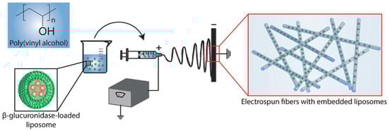 Scheme of assembly of electrospun polymeric fibers with embedded liposomes containing enzymes. Reproduced from [77] with permission from Creative Commons Attribution License.