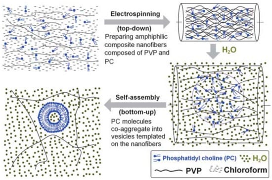 Schematic diagram illustrating the self-assembly of liposomes from PVP-PC electrospun nanofibers. Reprinted with permission from [97] the Royal Society of Chemistry; permission conveyed through the Copyright Clearance Center, Inc.
