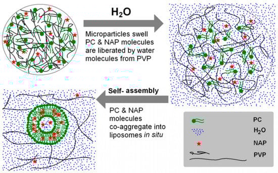 Schematic diagram illustrating the self-assembly of liposomes from microparticles based on PVP-PC, containing naproxen (NAP) as a loaded drug agent. Used with permission of IOP Publishing, Ltd., from [96]; permission conveyed through the Copyright Clearance Center, Inc.