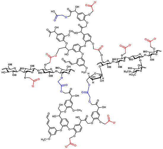 The three carboxymethylated macromolecules were then heated at an elevated temperature to cause thermal curing. Each of the three macromolecules contained OH and carboxyl functional groups. Both groups tended to undergo a condensation reaction at an elevated temperature to form an ester linkage with the loss of water molecules. The result is that a 3D structure of covalently bonded lignin, cellulose, and hemicelluloses forms, as shown in Figure 3. The produced structure is loaded with chelating ligands for metal ions; in addition, it is expected to be highly porous.