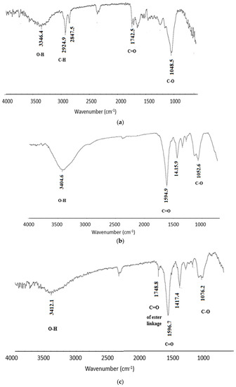 As mentioned earlier, the OISW is composed of cellulose, lignin, and hemicelluloses; the IR spectrum (Figure 4a) of the waste clearly shows peaks corresponding to the functional groups present in the OISW components. The spectrum shows a band at 3346 cm−1 corresponding to O-H stretching and two bands at 2924.9 and 2847.5 cm−1 corresponding to C-H stretching. The spectrum also shows several bands in the region of 1650 to 1742 that could be attributed to C=O of ester, aldehyde, and carboxyl functional groups, and several weak bands appear at about 1600–1610 corresponding to C=C of lignin aromatic rings, in addition to the O-C-O that mainly represents the glycosidic linkage in cellulose and hemicelluloses. The IR spectrum of the carboxymethylated OISW is shown in Figure 4b; the spectrum shows a broad band that stretches from 3500 to 2800 cm−1 corresponding to O-H of carboxyl and alcohol. A strong band appears at 1594 cm−1 corresponding to the stretching of C=O of the carboxylate functionality. The bands that represent the carbonyl of aldehyde and ester appear in the IR of OISW and disappear in the spectrum of CMOISW. This could be attributed to the treatment with NaOH during the carboxymethylation process, since under these conditions, the ester undergoes hydrolysis, and the aldehyde undergoes oxidation. The IR spectrum of CMOISW after curing shows a new band at 1748 cm−1 corresponding to the C=O of ester linkage that is formed by a condensation reaction between carboxyl and the O-H groups of the carboxymethylated OISW components.