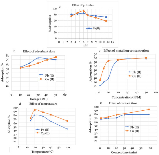 The effect of (a) pH on adsorption efficiency (time 30 min, temperature 25 °C, adsorbent dose 50.0 mg, metal ion concentration 30.0 mg, and solution volume 10.0 mL), (b) adsorbent dose (CMOISW) (time 30 min, temperature 25 °C. pH 6.0, metal ion concentration 30.0 mg, and solution volume 10.0 mL), (c) metal initial concentration (time 30 min, temperature 25 °C, adsorbent dose 50.0 mg, pH 6.0, and solution volume 10.0 mL), (d) temperature (time, 30 min, temperature 25 °C, adsorbent dose 50.0 mg, metal ion concentration 30.0 mg, and solution volume 10.0 mL), and (e) contact time (temperature 25 °C, adsorbent dose 50.0 mg, metal ion concentration 30.0 mg, and solution volume 10.0 mL).