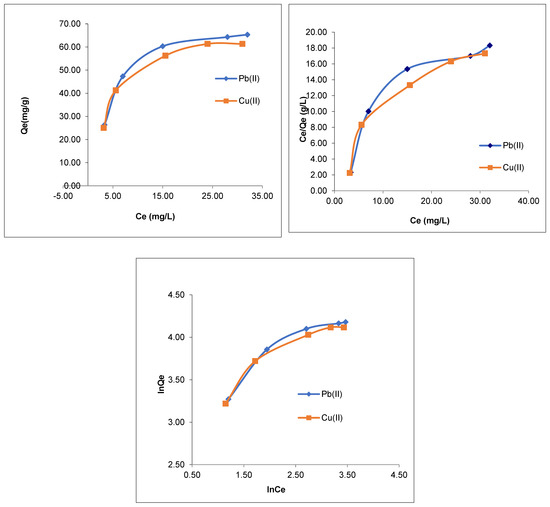 The Langmuir (Equation (3)) and Freundlich isotherm (Equation (5)) models were followed to determine the adsorption equilibrium between the Pb(II) and Cu(II) ions and the 3D polymer CMOISW in water [38]. They were also utilized to assess the metal ion dispersion on the CMOISW surfaces at equilibrium. One of the factors that may affect the type of isotherm followed in the adsorption is the correlation coefficient (R2) [38].
