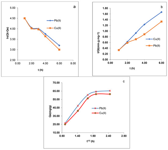 The Pb(II) and Cu(II) ion adsorption by CMOISW was analyzed using various kinetic models to understand the nature of the adsorption mechanism. Pseudo-first- and second-order models, two of the most popular kinetic models, were followed to simulate the metal adsorption by the CMOISW adsorbents. The used kinetic models are depicted in Equations (7) and (8) [39].
