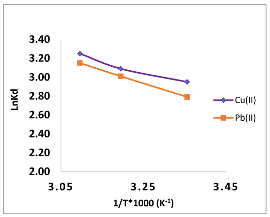 where T (K) is the solution temperature, R is the ideal gas constant (J/mol K), Cads is the equilibrium Pb(II) adsorbed quantity (mg/L), Ce is the equilibrium concentration (mg/L) in the supernatant, and Kc is an apparent constant of the thermodynamics [53].