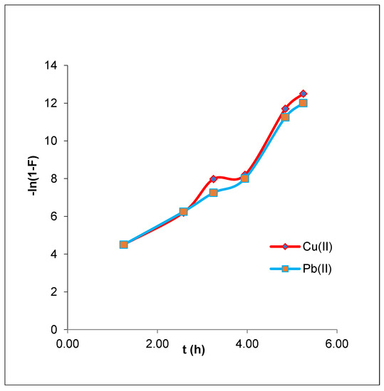 According to Equation (15), if plotting ln(1 − F) vs. t produced a straight line that passed through the origin, then the adsorption process includes diffusion through a liquid film around the CMOISW. Qe is the equilibrium (mg/g) adsorption capacity (Figure 11).