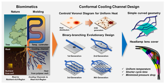 In this study, an evolutionary cooling channel, a new methodology for designing a conformal cooling channel, was proposed. This methodology was devised by imitating the way that a plant’s roots grow towards a nutrient-rich location. Additionally, Murray’s law was applied to increase the cooling efficiency through minimizing the pressure loss of the cooling water inside the cooling channel. The proposed method was applied to the specimen shape to verify the concept, and it was confirmed that efficient cooling was achieved by applying it to the headlamp lens cover part of an actual vehicle. When this methodology was applied, the temperature deviation of the part could be improved by about 46% in just third generations, and the pressure loss could be reduced by about 10 times or more compared to the result of applying the straight-line cooling channel.