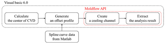 In this study, the concept of evolution was introduced by mimicking the growth of plant roots. In the first generation, CVD is used to calculate the center of mass on the surface of the product, and only one cooling channel passing through it is created. The method of creating a cooling channel was automated by Moldflow API. After generating an offset profile separated by a certain distance on the product surface, a cooling channel is created by B-spline curve following the created points [16]. The flowchart of this methodology is represented in Figure 2.