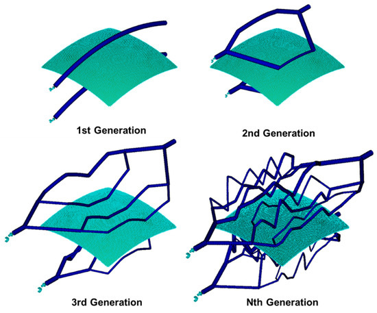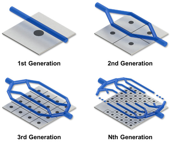 In addition, as the roots of plants grow over time, the concept of evolution of the cooling channel was introduced by mimicking the generation of small-diameter roots from large-diameter roots. After the cooling channel was fabricated within one generation, the diameter, depth, and flow rate of the cooling channel were optimized as design variables. If the temperature deviation value as the objective function has not reached a certain temperature threshold after optimization, it evolves to the next generation, and all cooling channels created in the previous generation were deleted. In the next generation, the cooling channel was subdivided and installed based on the cooling channel of the previous generation, and the same optimization process was repeated. Using this methodology, the cooling channel continued to evolve until it reached the objective function. The schematic of this approach is Figure 1.