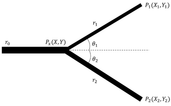 Here, denotes the branching start point to be calculated. defines the diameter before branching, and and define two diameters after branching, respectively. and are the calorific center points of the region calculated by CVD. , , and are coordinates of and . and are relative angles to the previous channel before branching, respectively.