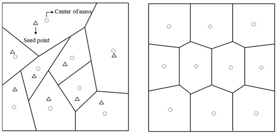 Unlike VD, the seed point and center of mass of the generated CVD region coincide, as shown in Figure 5. Equation (4) was used for the CVD generation to increase the uniformity of the mesh size using CVD [19]. Since the previous calculation used three-dimensional coordinates, it had the advantage of being immediately applicable to this study.