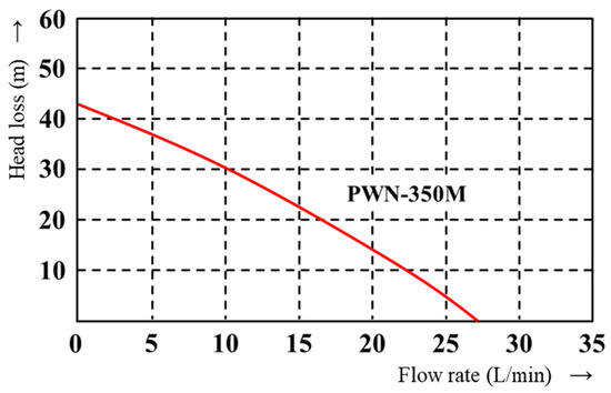 Figure 6 shows the pump performance curve of the pump PWN-350M in Regloplas 150 KL temperature controller (Regloplas AG, St. Gallen, Switzerland) selected for this study. Referring to the graph, the maximum flow rate reaches approximately 27 L/min at 0 m of head (pressure) loss inside of the cooling channel. Therefore, a flow rate of 27 L/min or more acts as a non-discharging flow rate. Thus, this value was defined as the maximum flow rate.