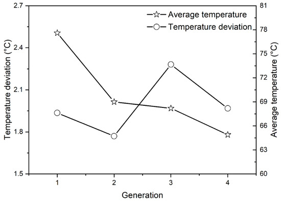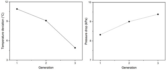 Figure 8 confirms that the average temperature continued to decrease as the cooling channel evolved. However, the temperature deviation decreased until 2nd generation and then increased at 3rd generation. This resulted from the effect of excessive local cooling, and it meant that the deviation value was more suitable than the average temperature value to determine the cooling channel performance.