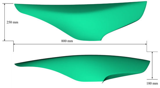 After verification using the rectangular curved surface geometry, the proposed cooling channel design method was applied to an automobile headlamp lens cover. The product’s shape and geometry are shown in Figure 9. The material was polycarbonate (PC) (Staren ER-1000, Samsung SDI, Yongin, Republic of Korea). Generally, it is difficult to achieve sufficient cooling performance with only a straight-line cooling channel due to the many curved surfaces in the product shape.