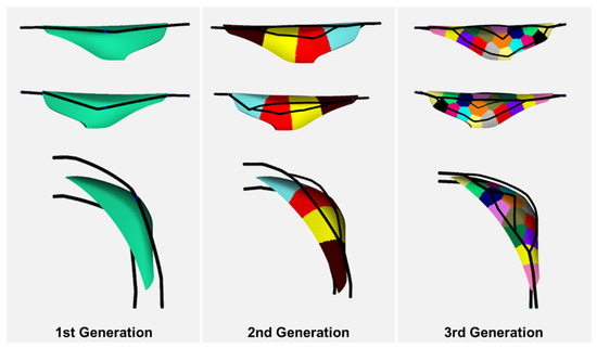 Figure 10 shows the result of the cooling channel evolution confirming that the third generation satisfied the objective function. In the first generation, only one cooling channel was installed. In the second generation, two child cooling channels were branched from one parent cooling channel, so two child cooling channels were installed. The color displayed on the product represents the generated CVD, and since it is the 2nd generation, a total of four CVDs were generated. In the third generation, four child cooling channels were installed, and 16 CVDs were generated. However, only three child cooling channels were installed due to the lack of the center points.