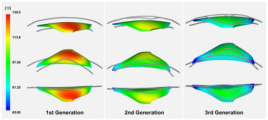 The part temperature distribution after the evolution of the cooling channel is shown in Figure 11. In the first generation, a high temperature was generated in the center of the product. This was because only a single cooling channel was installed, so it could not exhibit sufficient cooling efficiency. The cooling efficiency was increased relatively in the second generation, and low temperatures were displayed throughout the product with sufficient cooling efficiency in the third generation.