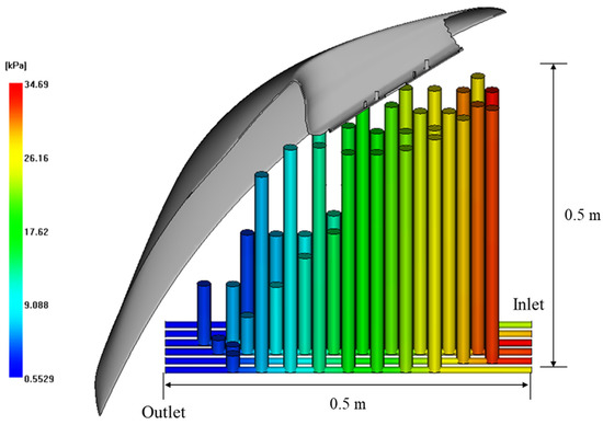 To compare the cooling efficiency to the straight-line cooling channel, the pressure drop inside of the cooling channel was checked, as shown in the in the right of Figure 12. Although the cooling channel was subdivided into child cooling channels, the total pressure drop generated in the cooling channel was <10 kPa. Figure 13 represents the pressure drop results of core side using the straight-line cooling channel with the same temperature deviation. The sum of the pressure drops in all cooling channels is over at least 100 kPa. This was because the shape of the product was deep and wide, so the conventional cooling channel design required a lot of baffle pipes, leading to a higher pressure loss.