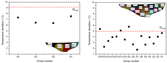 Figure 14 shows the standard deviation of the part temperature of each CVD area, and overall temperature deviation, . From the results of the second generation on the left in Figure 14, the cooling efficiency is not sufficient, as both and the temperature deviation for each area were above the target objective value of 5 °C. However, from the results of the third generation on the right, the temperature deviation of most areas, including , was 5 °C or less. Therefore, the cooling channel evolution based on the segmented regions effectively improved the cooling efficiency.