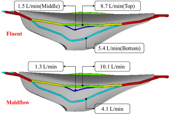 In Table 2, the difference in flow rate between the CFD result and Moldflow is shown as a percentage. The CFD analysis result exhibited 20% less, 6% more, and 22% more flow velocity at the top, middle, and bottom cooling channels, respectively. To check the influence of these differences between CFD and Moldflow results, the convective heat transfer coefficient directly affecting the heat transfer amount was checked using Equations (10) and (11). The 22% of difference in flow velocity induced a 12% of difference in the convective heat transfer coefficient [23].