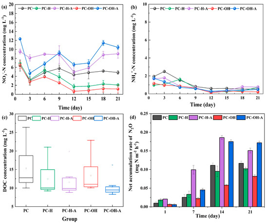 Considering the potent greenhouse effect of N2O, the time profile of N2O net accumulation rates was measured (Figure 1d). The rates of N2O net accumulation in PC-H-A and PC-OH-A were notably higher than those of PC-H and PC-OH, respectively (p < 0.05), which indicated the occurrence of incomplete denitrification owing to insufficient supply of carbon sources. As the product of incomplete heterotrophic denitrification, the emission of N2O is affected by the amount and availability of carbon sources, C/N ratio, initial NO3−-N concentration, temperature, and pH [24,25,26]. In this study, the rates of N2O net accumulation might be mainly affected by the amount and availability of carbon sources caused by different pretreatment methods. The N2O emissions in PC-OH (day 21) accounted for 0.22% of the NO3−-N denitrified, which was higher than the results of Greenan et al. [27] (0.003–0.028%) but lower than that of Moorman et al. [28] (0.62%). Therefore, most of the NO3−-N denitrified in PC-OH was converted to N2 without significant N2O accumulation. Considering the denitrification performance, DOC release, and N2O emission, it is feasible to use PC-OH for the advanced nitrogen removal of wastewater with a low C/N ratio, and the mechanisms of nitrogen removal should be further explored for PC-OH.